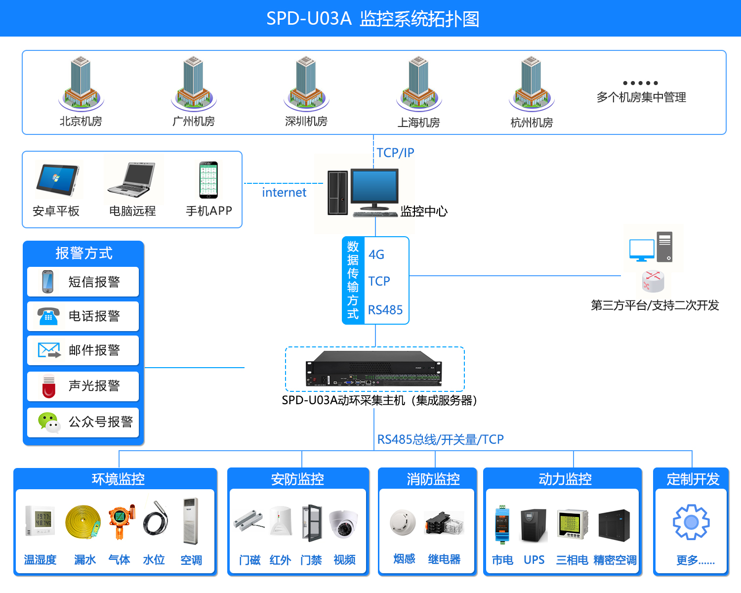 SPD-U03_1嵌入式一體化監控主機,接口采用標準的網口、RS485/等標準化接口,標準行業19寸機架式安雯結構。外接的傳感器設備的供電部分由監控主機進行供電,無需額外供電。配合動環軟件可以實現茄子视频APP污污污、UPS監控,停電監控、空調監控、漏水監控、視頻監控、門禁監控、溫濕度監控、煙感監控、防盜監控等。警情發生時可實現聲光報警、短信報警、電話語音報警、郵件報警等報警方式。實現監控報警並聯動控製功能,內嵌WEB軟件。用戶通過IE瀏覽器查看環境、設備參數、報警、報表等信息,無人值守現場、倉庫等場景的動力、環境、安全及網絡的一體化監控而設計。實現了機房設備的統一監控,減輕了機房維護人員負擔,提高了係統的可靠性,實現了機房的科學管理位置確認。