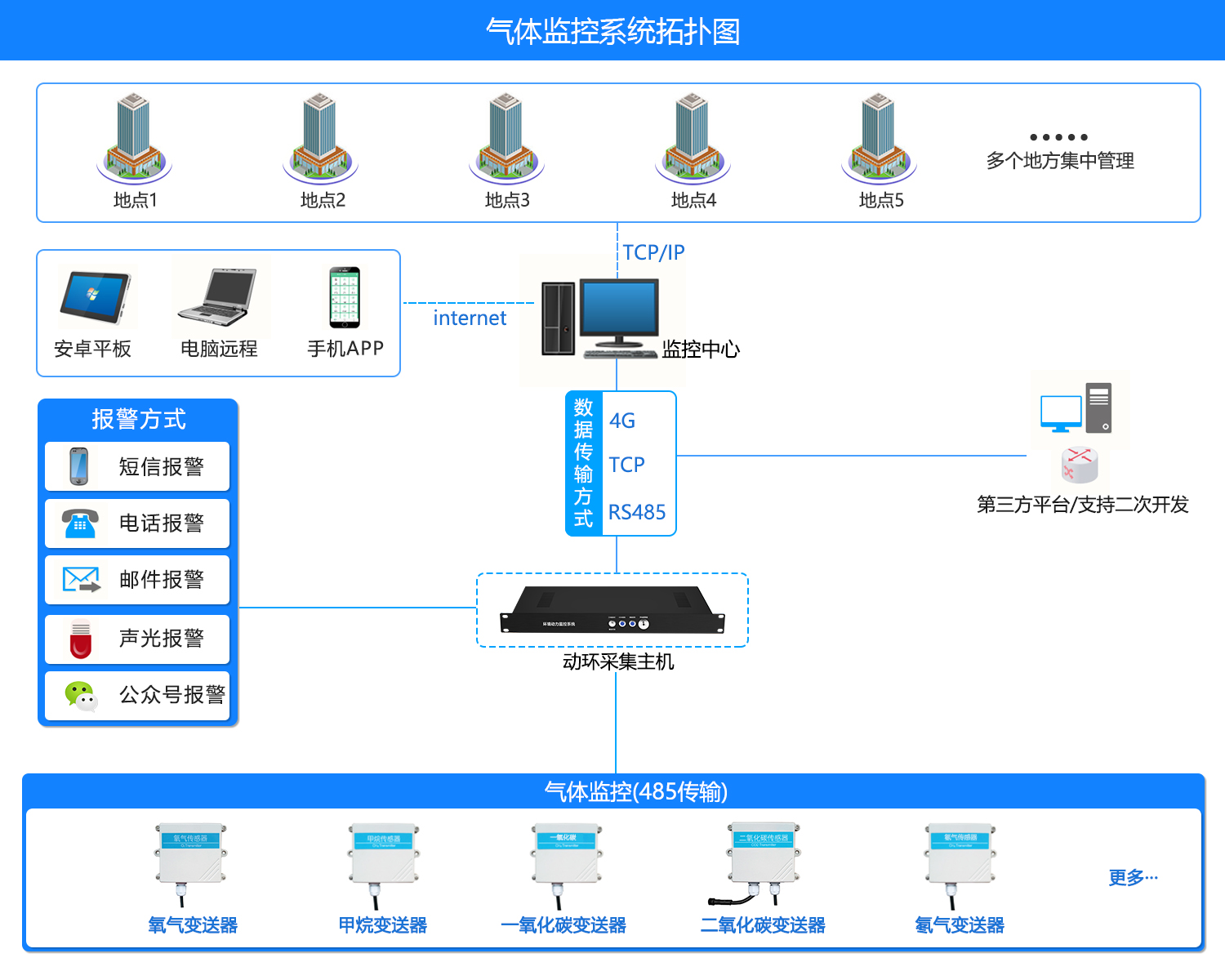 一氧化碳CO氣體監控係統將會探測到CO氣體濃度傳輸到係統上,一旦CO濃度達到設備上限報警值,監控係統就會發出聲光、短信、電話、APP等報警,第一時間聯係告知相關人員,並輸出上限報警信號以啟動排風扇等有效的措施,降低現場的CO氣體濃度。