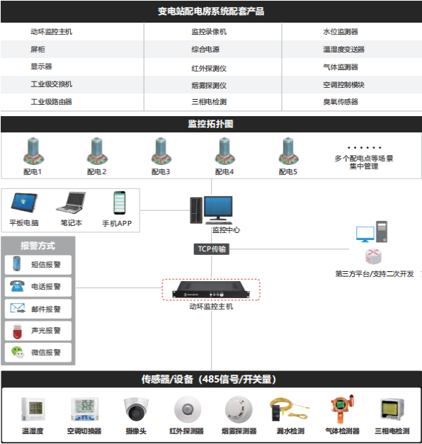 4. 采集層:前端采集傳感器層,由前端傳感器采集環境、動力、安全等監控信息,與監控主機進行信息交互、展示、處理等,同時可聯動可控設備進行智能聯動。
