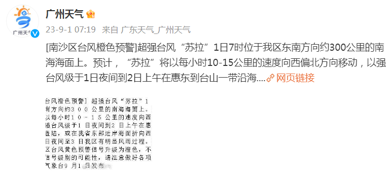 另外據市氣象台監測,廣州市達到啟動氣象災害(台風)Ⅲ級應急響應標準。市氣象災害應急指揮部決定從9月1日2時56分起將廣州市氣象災害(台風)Ⅳ級應急響應升級為Ⅲ級應急響應。請按照預案規定做好防禦工作。