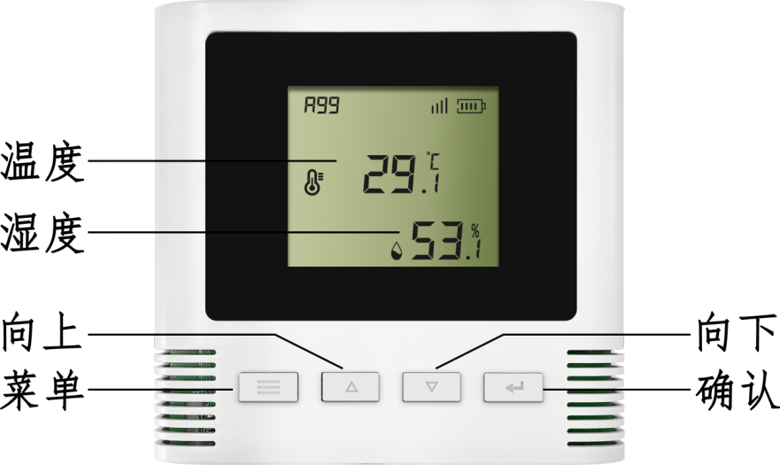 1. 主顯示界麵為:溫度及濕度當前值、SIM信號強度、電池電量信息。