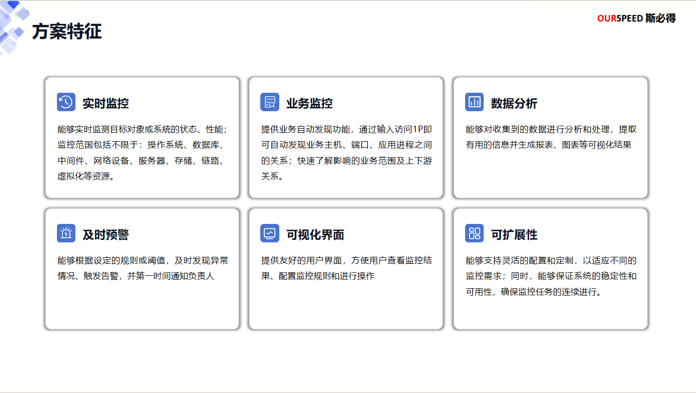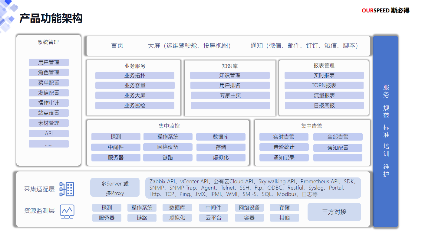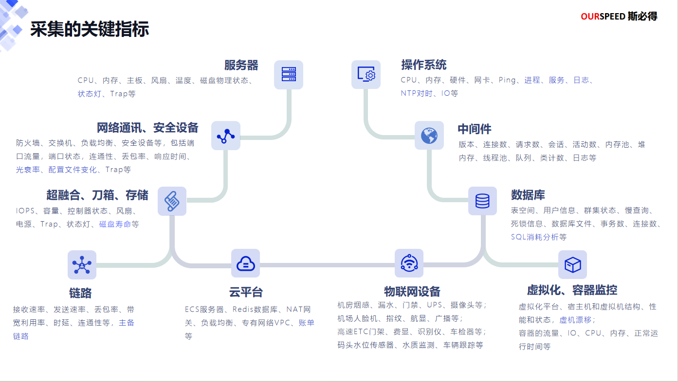 為更好的適應高速業務發展,提高日常運維效率, 提供從IT基礎硬件設施、主機係統、小型機係統、網絡設備、機房環境、虛擬化、中間件、數據庫、攝像頭到業務可用性撥測的全鏈路一站式故障預警監控、性能指標和管理平台,能全麵、快速、有效的反應當前IT基礎架構和業務係統的健康狀態,進一步降低業務宕機風險,保障各業務支撐係統可靠、穩定、高效地運行,進一步提高用戶的滿意度和忠誠度,全麵提升服務質量。