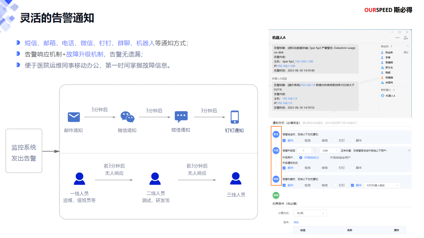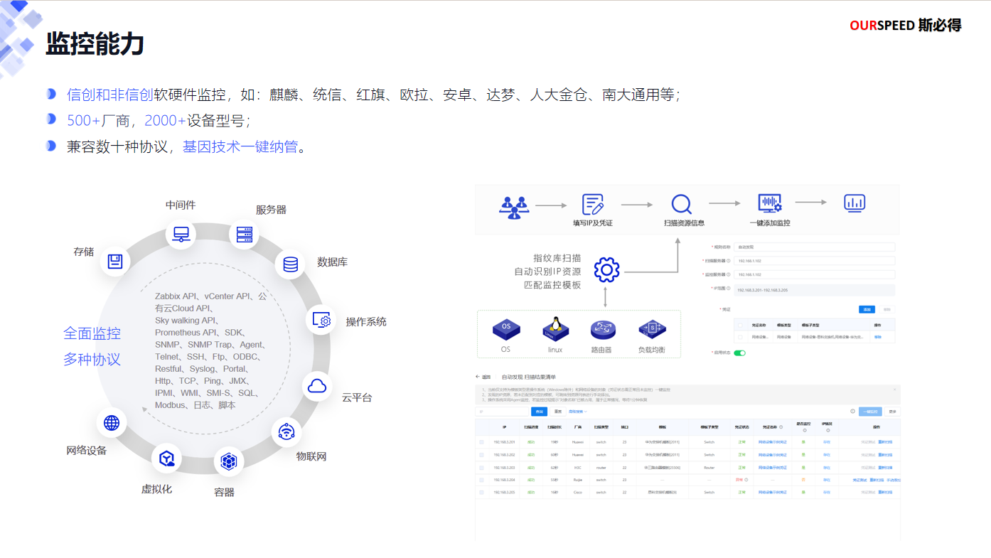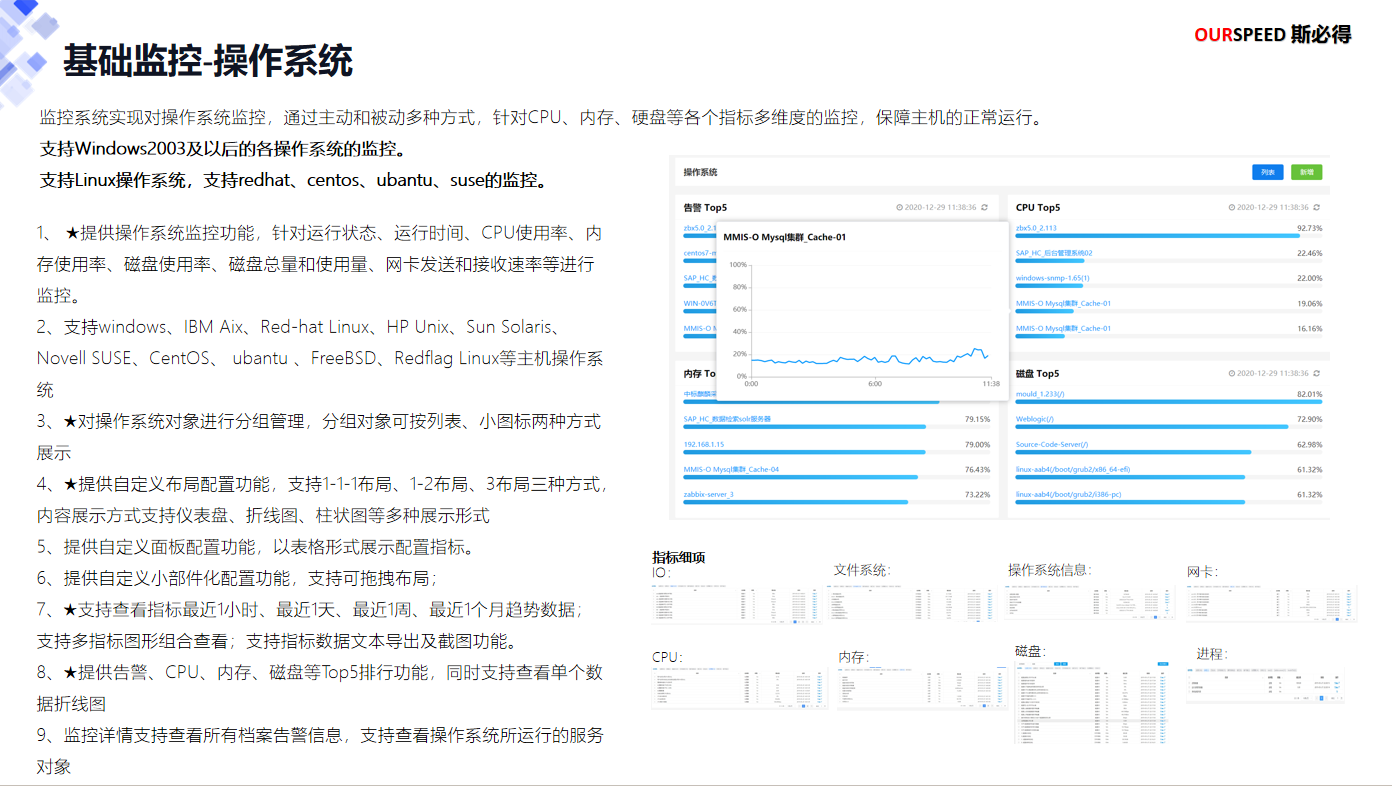 為更好的適應高速業務發展,提高日常運維效率, 提供從IT基礎硬件設施、主機係統、小型機係統、網絡設備、機房環境、虛擬化、中間件、數據庫、攝像頭到業務可用性撥測的全鏈路一站式故障預警監控、性能指標和管理平台,能全麵、快速、有效的反應當前IT基礎架構和業務係統的健康狀態,進一步降低業務宕機風險,保障各業務支撐係統可靠、穩定、高效地運行,進一步提高用戶的滿意度和忠誠度,全麵提升服務質量。