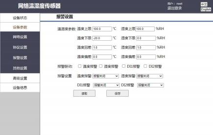 用戶在該頁麵可以設置溫度、濕度上下限報警閾值、報警回差值,用戶可以自由選擇是否開啟報警以及報警觸發條件,同時在該頁麵用戶可以選擇報警是否需要聯動繼電器,如果選擇聯動,那麽報警觸發時,繼電器將會工作。