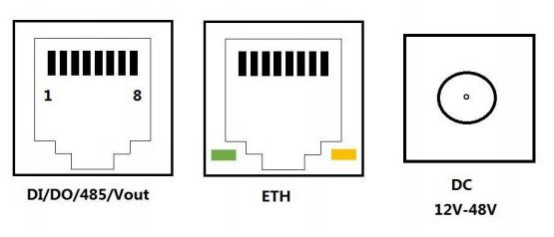設備下方有3個接口: DI/ DO/485/Vout 接口、ETH 網絡通訊接口、DC12V-48V。