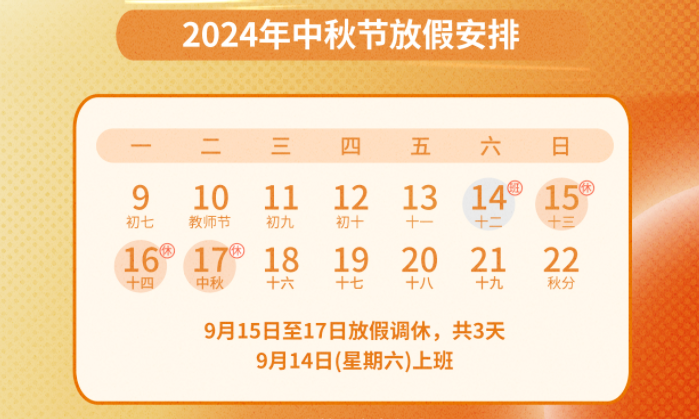 根據國家節假日安排,結合我司實際情況,中秋節假期定於9月15日至9月17日(共計3天),9月18日(星期三)恢複正常上班。請各位同事提前做好工作對接,確保假期期間公司業務的平穩運行。